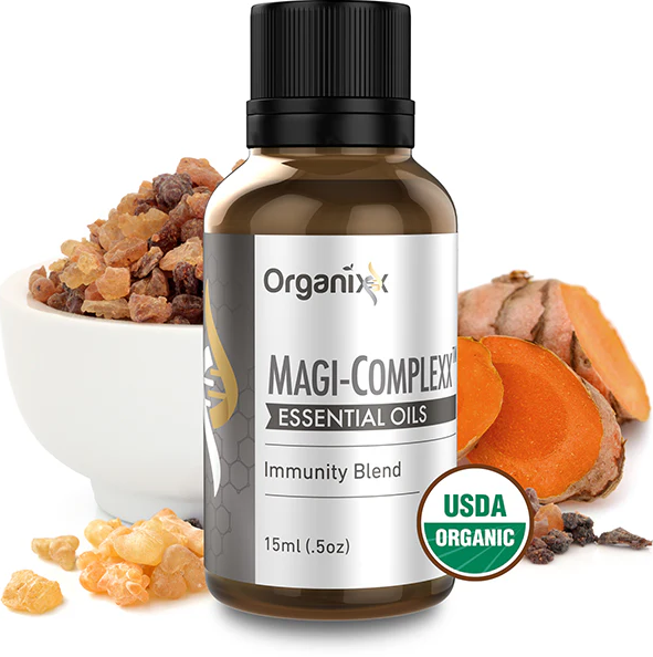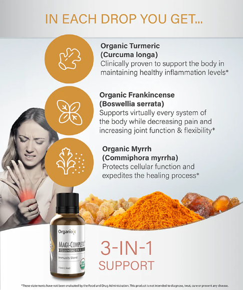 - Convenient essential oil blend of turmeric, frankincense, and myrrh